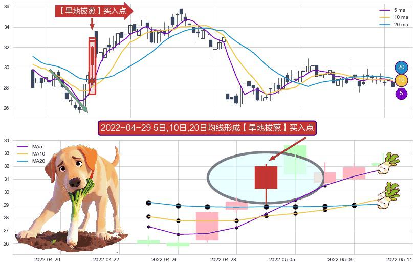 形态多维评估: ⚀ 2022-04-29日显现 5日-10日-20日均线 【旱地拔葱】买入点 看多信号,后市看涨,买入