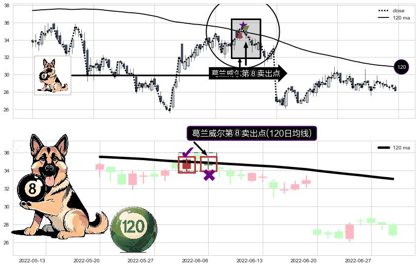 形态多维评估: ⚀ 2022-06-06-日显现 葛兰威尔均线 120日均线 第⑧卖出点 下降趋势的中继信号,后市看跌,卖出信号