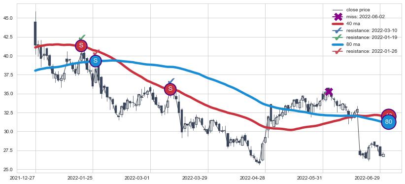 下跌趋势2021-12-27-2022-06-30,均线40, 80确认关键阻力3处