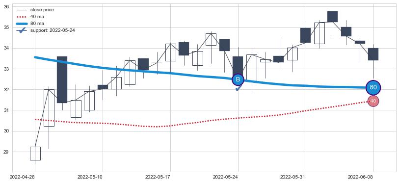 上涨趋势2022-04-28-2022-06-08,均线80确认关键支撑1处