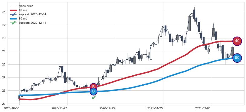 上涨趋势2020-10-30-2021-03-12,均线40, 80确认关键支撑1处