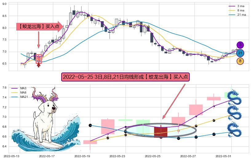 形态多维评估: ⚀ 2022-05-25日显现 3日-8日-21日均线 【蛟龙出海】买入点 看多信号,后市看涨,买入