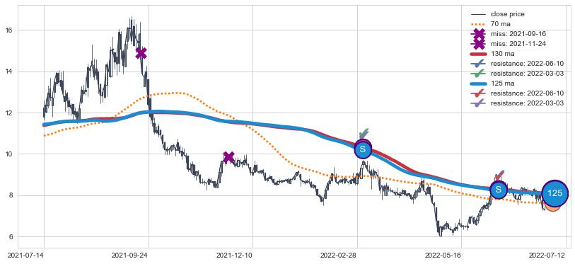 下跌趋势2021-07-14-2022-07-12,均线130, 125确认关键阻力2处