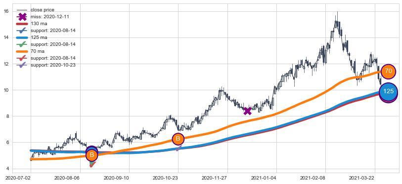 上涨趋势2020-07-02-2021-03-25,均线130, 125, 70确认关键支撑2处