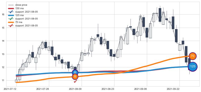 上涨趋势2021-07-12-2021-09-27,均线130, 125, 70确认关键支撑1处