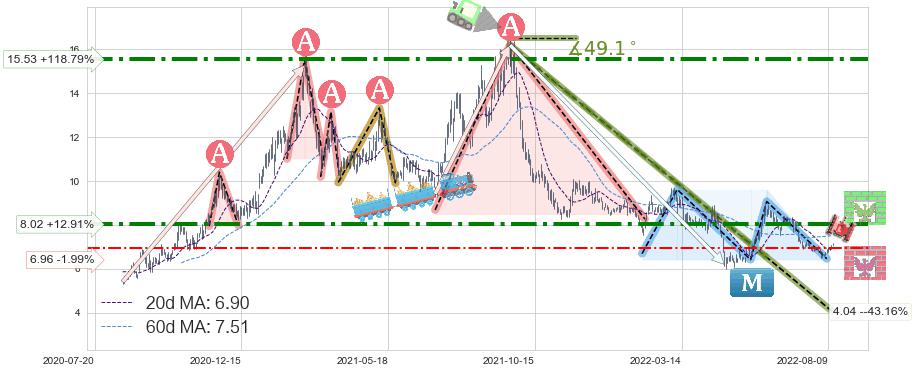 ♘ 阻力价格位8.02,可信任强度81.75%,距离最后交易2022-08-12形成的收盘价格7.10相差 +12.91%