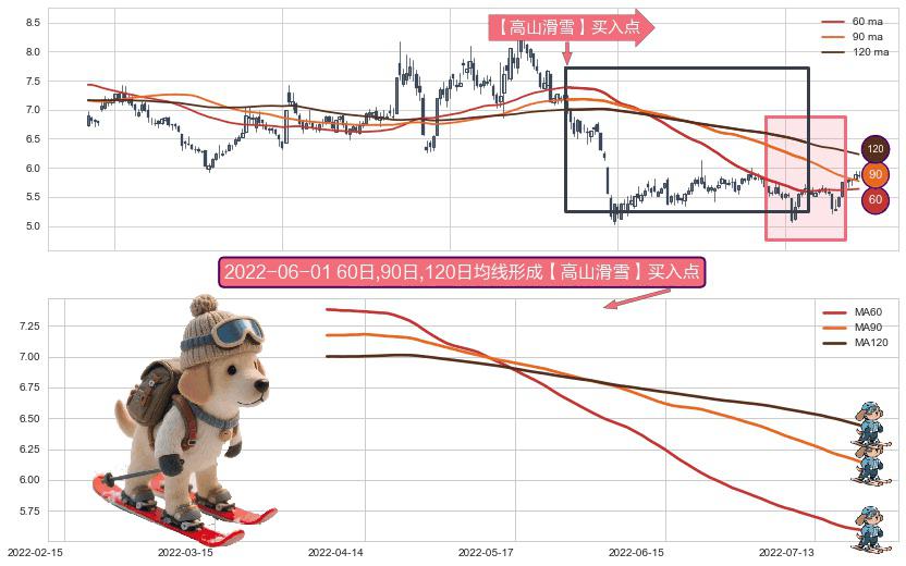 ⚀ 2022-04-07日-2022-07-21日显现 60日-90日-120日均线 【高山滑雪】买入点 看多信号,后市看涨,买入