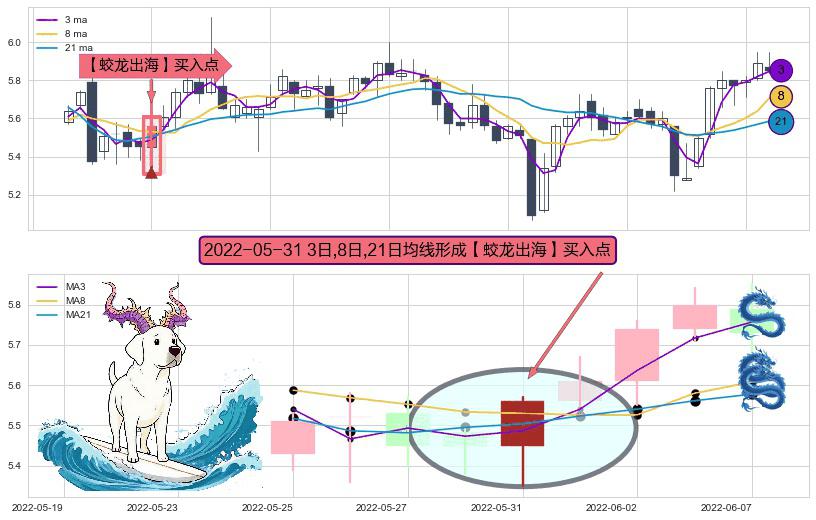 ⚀ 2022-05-31日显现 3日-8日-21日均线 【蛟龙出海】买入点 看多信号,后市看涨,买入