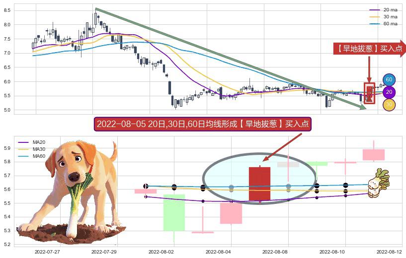 ⚀ 2022-08-05日显现 20日-30日-60日均线 【旱地拔葱】买入点 看多信号,后市看涨,买入