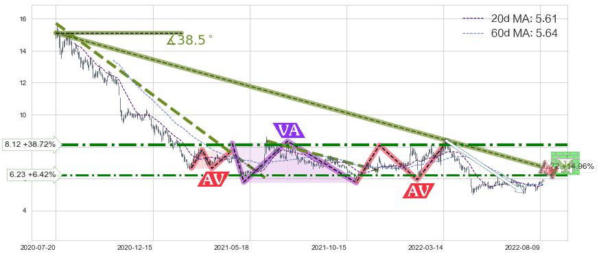♘ 在最后的下跌阶段2020-07-20至2022-08-10,存在 持续未破位的阻力位 ,阻力价格6.72,可信任强度88.68%,其距离最后价格5.85相差 +14.96%