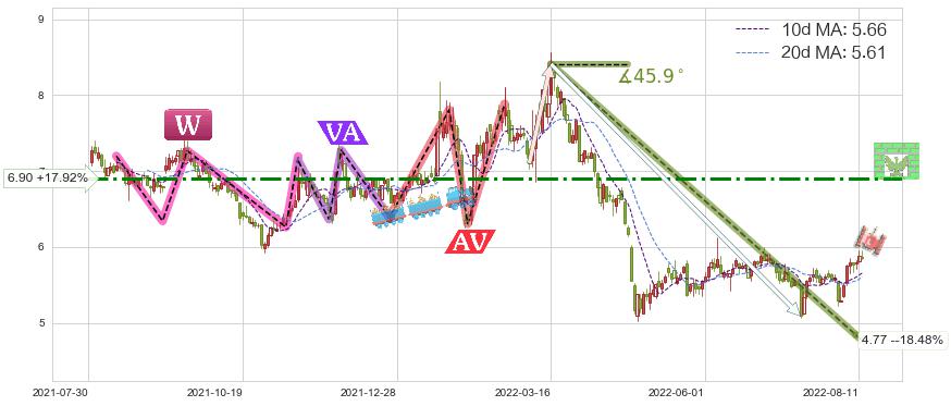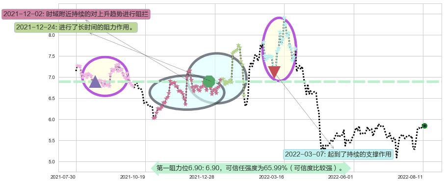 ♘ 阻力价格位6.90,可信任强度65.99%,距离最后交易2022-08-12形成的收盘价格5.85相差 +17.92%