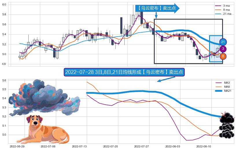 ⚀ 2022-07-13日-2022-08-12日显现 3日-8日-21日均线 【乌云密布】卖出点 看空信号,后市看跌,卖出