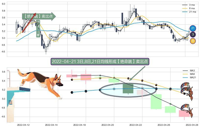 ⚀ 2022-04-21日显现 3日-8日-21日均线 【绝命跳】卖出点 看空信号,后市看跌,卖出