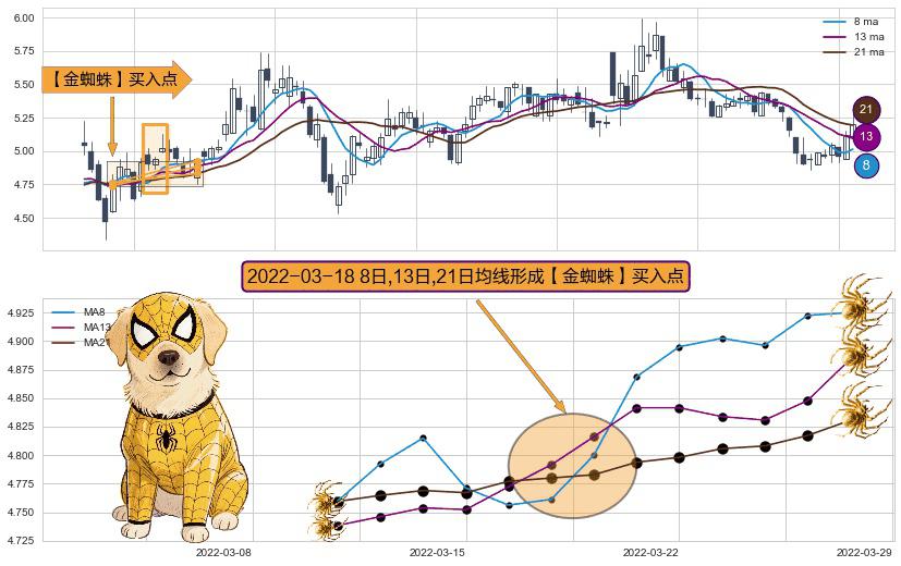 ⚀ 2022-03-18日显现 8日-13日-21日均线 【金蜘蛛】买入点 看多信号,后市看涨,买入