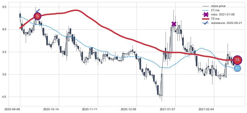 ⚁ MA3和MA8走势平行,且始终保持在短距离内,MA21始终在短中期均线上方,与短中期均线保持一定的距离,微微下行
