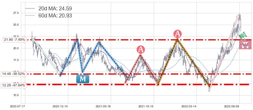 ♘ 支撑价格位21.80,可信任强度77.62%,距离最后交易2022-08-12形成的收盘价格23.56相差 -7.49%
