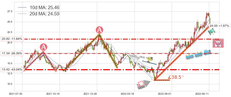 🍖 长线趋势跟踪组合短线均值回复[强支撑信号]2022-04-26-2022-08-12上升趋势依然成立(上涨趋势跟踪依然可行),短线价格略微下行回调(均值回复猜想),即将接近趋势提供的未破位的支撑价格:24.00。