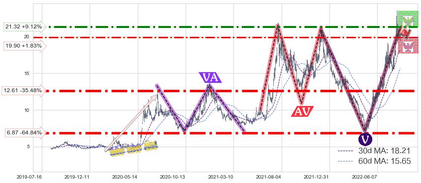 ♘ 阻力价格位21.32,可信任强度74.08%,距离最后交易2022-08-12形成的收盘价格19.54相差 +9.12%
