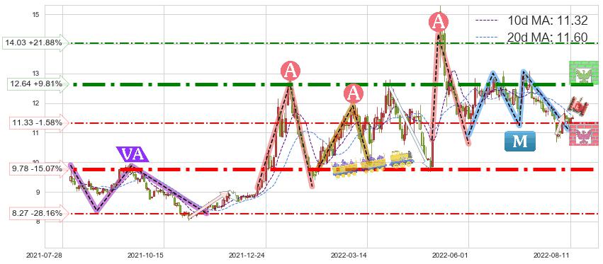 ♘ 支撑价格位11.33,可信任强度54.19%,距离最后交易2022-08-12形成的收盘价格11.51相差 -1.58%