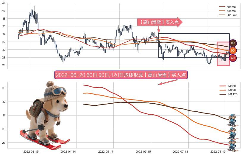 ⚀ 2022-04-20日-2022-08-12日显现 60日-90日-120日均线 【高山滑雪】买入点 看多信号,后市看涨,买入