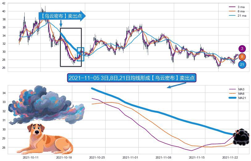 ⚀ 2021-10-21日-2021-11-22日显现 3日-8日-21日均线 【乌云密布】卖出点 看空信号,后市看跌,卖出
