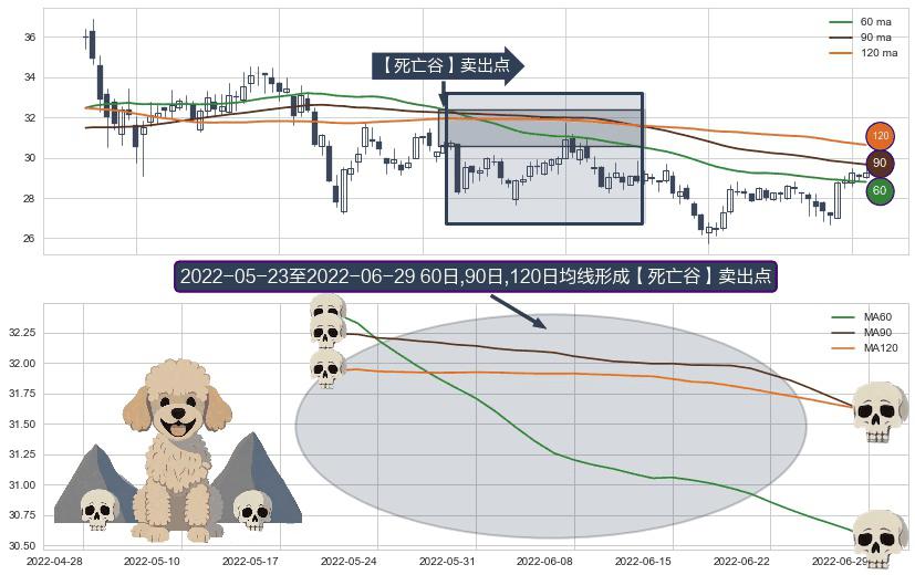 ⚀ 2022-05-24-日至2022-06-29-日显现 60日-90日-120日均线 【死亡谷】卖出点 看空信号,后市看跌,卖出