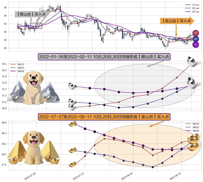 ⚄ 2022-07-28-日至2022-08-11-日显现 10日-20日-30日均线 【金山谷】买入点 其再次确认了买入信号,可靠性更强,买入