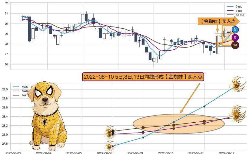 ⚀ 2022-08-10日显现 5日-8日-13日均线 【金蜘蛛】买入点 看多信号,后市看涨,买入