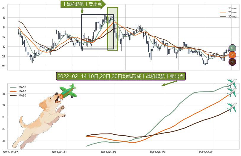 ⚀ 2022-01-17日-2022-03-04日显现 10日-20日-30日均线 【战机起航】卖出点 看空信号,后市看跌,卖出