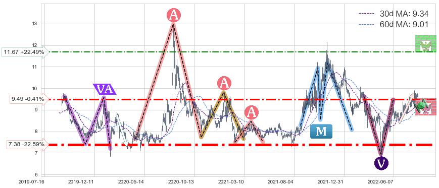 ♘ 支撑价格位9.49,可信任强度61.78%,距离最后交易2022-08-12形成的收盘价格9.53相差 -0.41%