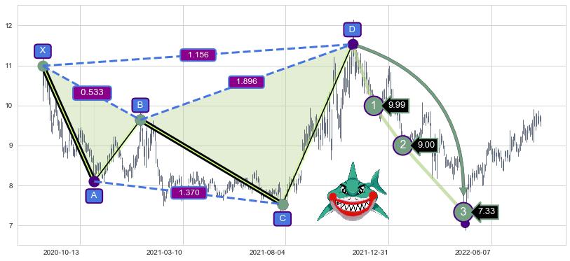 ➣ 已完成【鲨鱼】形态起点X: 2020-08-14, 终点D: 2021-11-12, 共302交易日