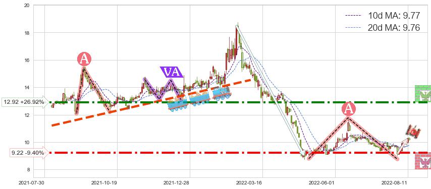 ♘ 支撑价格位9.22,可信任强度73.00%,距离最后交易2022-08-12形成的收盘价格10.18相差 -9.40%