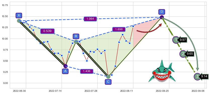 ➣ 未完成【鲨鱼】形态起点X: 2022-06-28, 已到达C点: 2022-08-02, 预测最终D点: 2022-08-23, 共40交易日