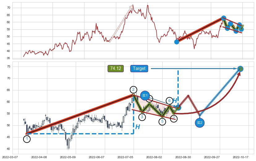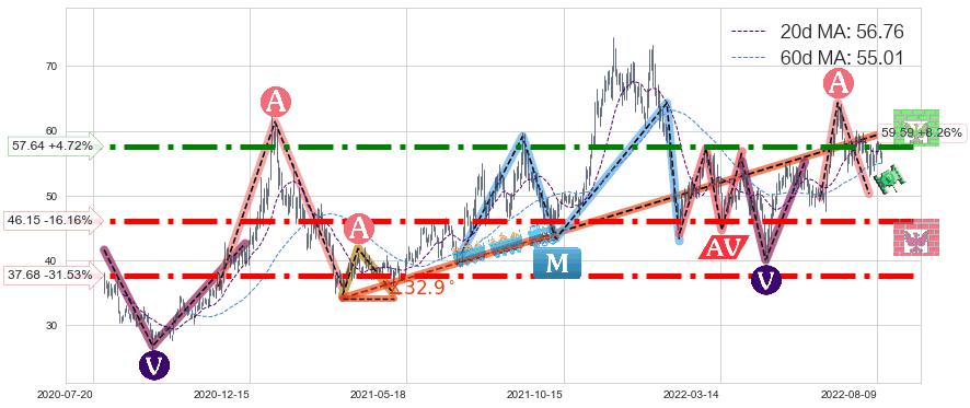 ➢ 【仅预测突破】最后价格:55.04与预测突破价格:57.60→【空间较大】后续最小【整理】第一目标价格→(2022-10-17: 74.12 )