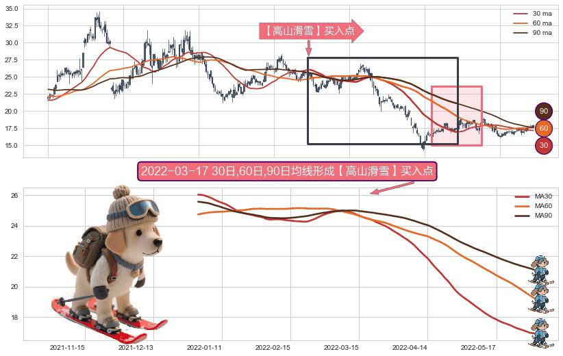 ⚀ 2021-12-30日-2022-06-01日显现 30日-60日-90日均线 【高山滑雪】买入点 看多信号,后市看涨,买入