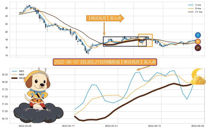 ⚀ 2022-05-17日-2022-06-27日显现 3日-8日-21日均线 【烘云托月】买入点 看多信号,后市看涨,买入