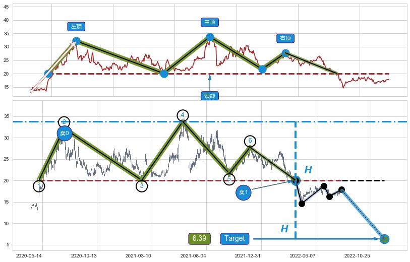 | 5 🅚:【断头铡刀】卖出点 ➕ 📐:三重顶下行突破支撑位破位, 猜想持续下沉下跌,被突破的支撑位已变为阻力位 ☞ 看空信号 ⇥ 【均线】交织【图形】⇥ 综合量化分数: 33 | > |