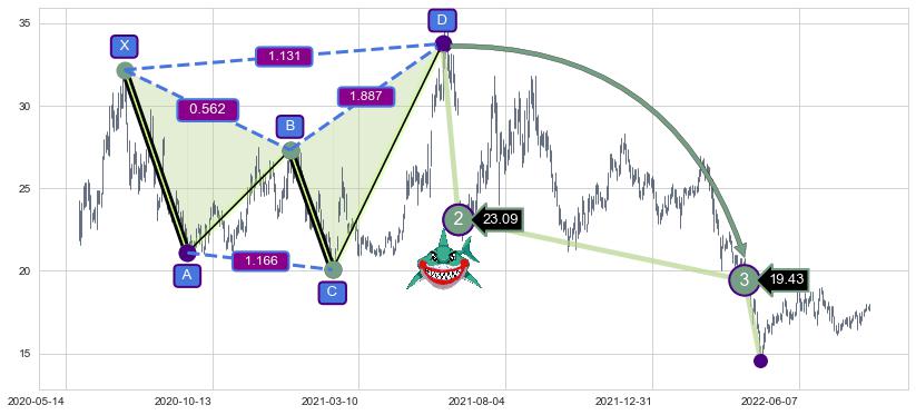 ➣ 已完成【鲨鱼】形态起点X: 2020-07-13, 终点D: 2021-06-03, 共218交易日