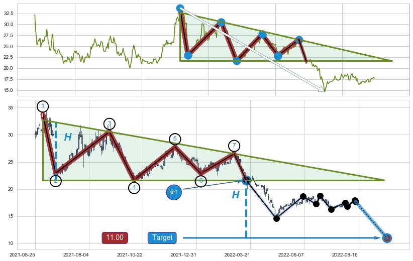 ➢ 【多方力量耗尽,空方打破攻守平衡点】下降三角形中继整理, 已在2022-03-15突破【支撑】颈线 21.65 →演变成下降通道