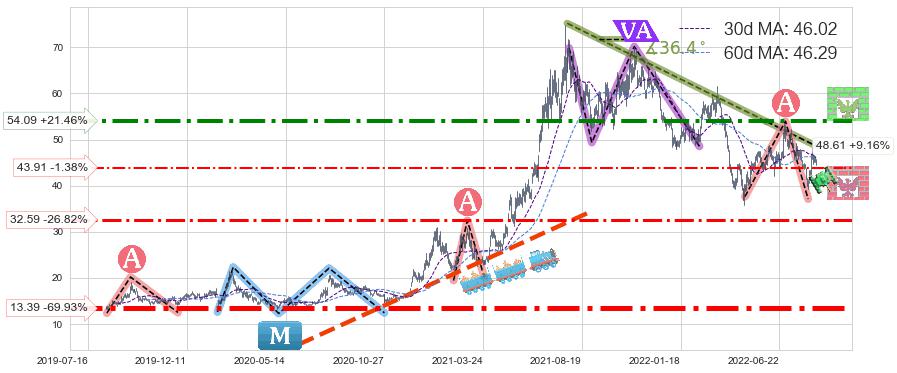♘ 阻力价格位54.09,可信任强度83.75%,距离最后交易2022-08-12形成的收盘价格44.53相差 +21.46%