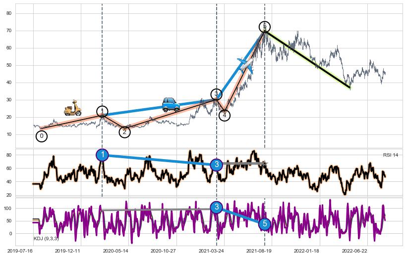➢ 第三,五驱动浪端点:【KDJ】走势出现【常规背离 & 反转信号】背离程度69.61%,背离夹角角度119.9˚,背离程度较大
