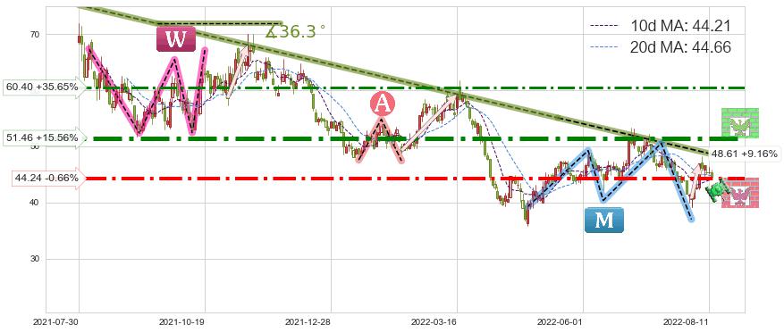 ♘ 阻力价格位51.46,可信任强度89.66%,距离最后交易2022-08-12形成的收盘价格44.53相差 +15.56%