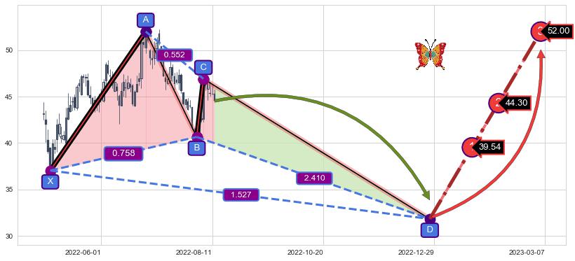 ➣ 未完成【蝴蝶】形态起点X: 2022-04-26, 已到达C点: 2022-08-05, 预测最终D点: 2022-12-27, 共172交易日