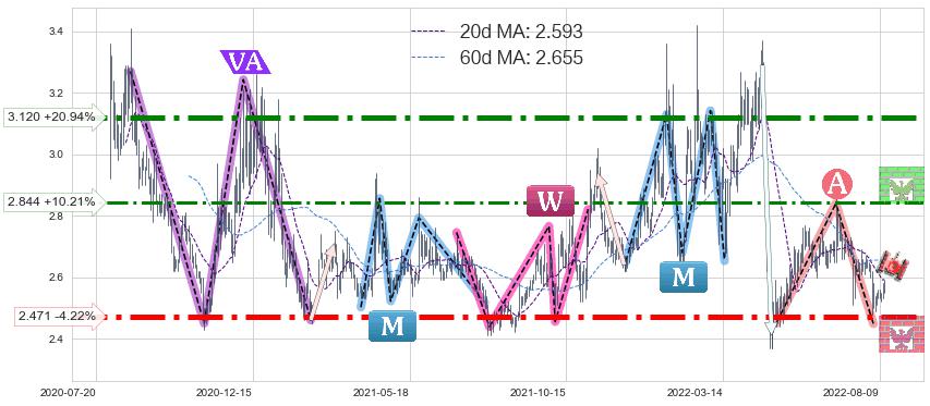 ♘ 阻力价格位2.844,可信任强度65.92%,距离最后交易2022-08-12形成的收盘价格2.580相差 +10.21%