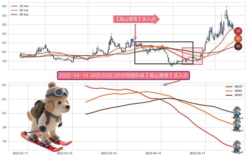 ⚀ 2022-02-23日-2022-06-06日显现 30日-60日-90日均线 【高山滑雪】买入点 看多信号,后市看涨,买入