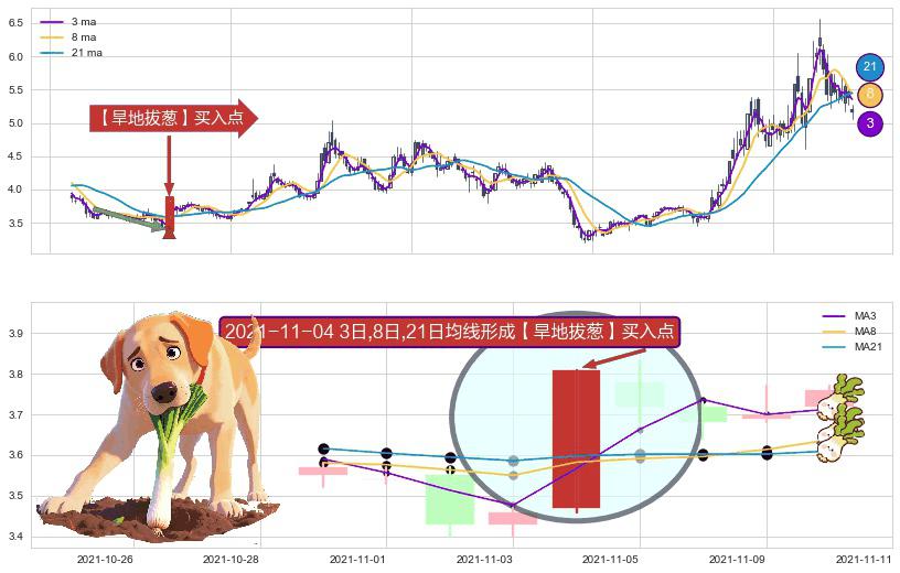 ⚀ 2021-11-04日显现 3日-8日-21日均线 【旱地拔葱】买入点 看多信号,后市看涨,买入