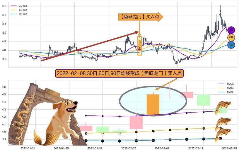 ⚀ 2022-02-08日显现 30日-60日-90日均线 【鱼跃龙门】买入点 看多信号,后市看涨,买入