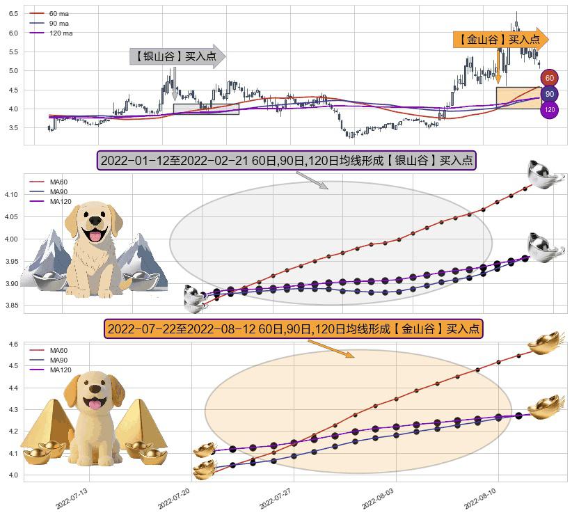 ⚄ 2022-07-25-日至2022-08-12-日显现 60日-90日-120日均线 【金山谷】买入点 其再次确认了买入信号,可靠性更强,买入