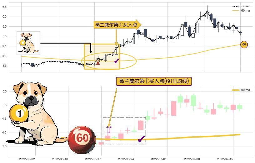 ⚀ 2022-06-20-日显现 葛兰威尔均线 60日均线 第买①入点 走势反转见底信号,后市看涨,买进信号