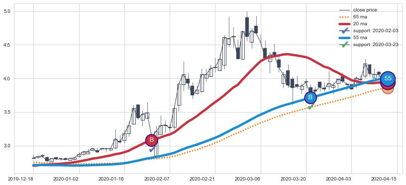 ➢ 最优均线组合共正确确认支撑阻力信号4处,正确确认率 80.00%